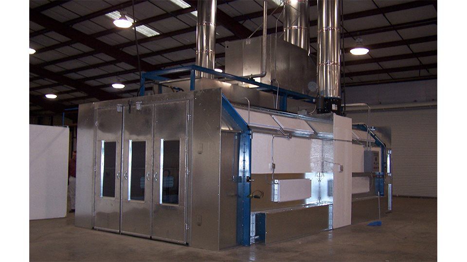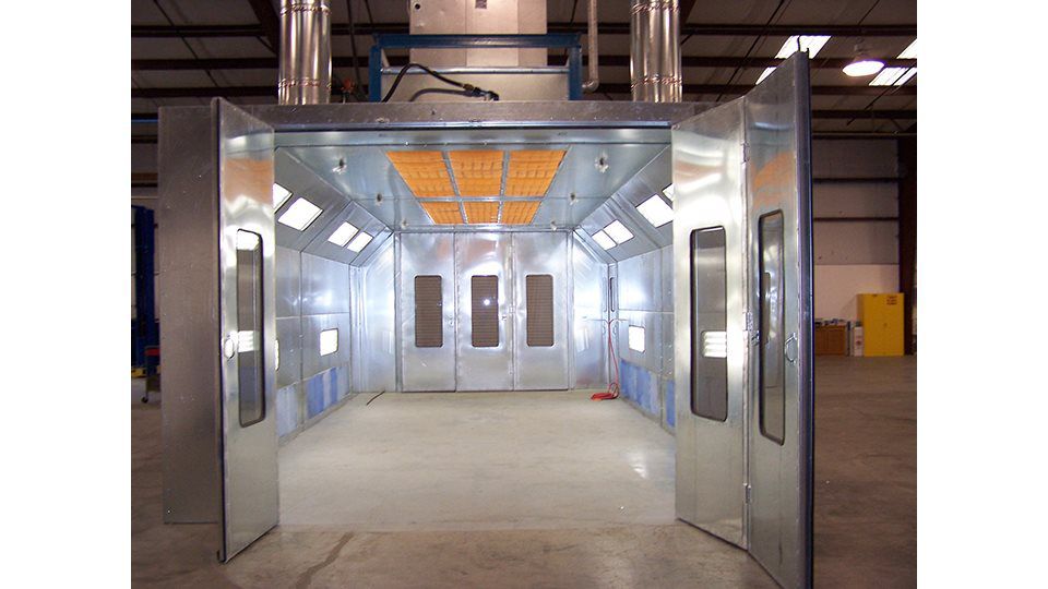 The side down draft paint booth draws fresh air through a double set of intake filters in the ceiling. The filtered air is pulled down and then exhausted on each side away from the center of the booth to the exhaust filters at floor level along the paint booth sides. This booth can come with drive through doors and is also available with a heated Air Make Up unit that can be added with relative ease.